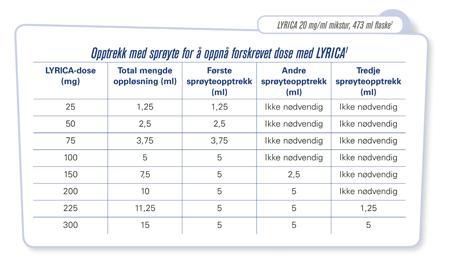Lyrica som mikstur fås i plastflasker i styrken 20 mg/ml. Flasken inneholder 473 ml mikstur, oppløsning.