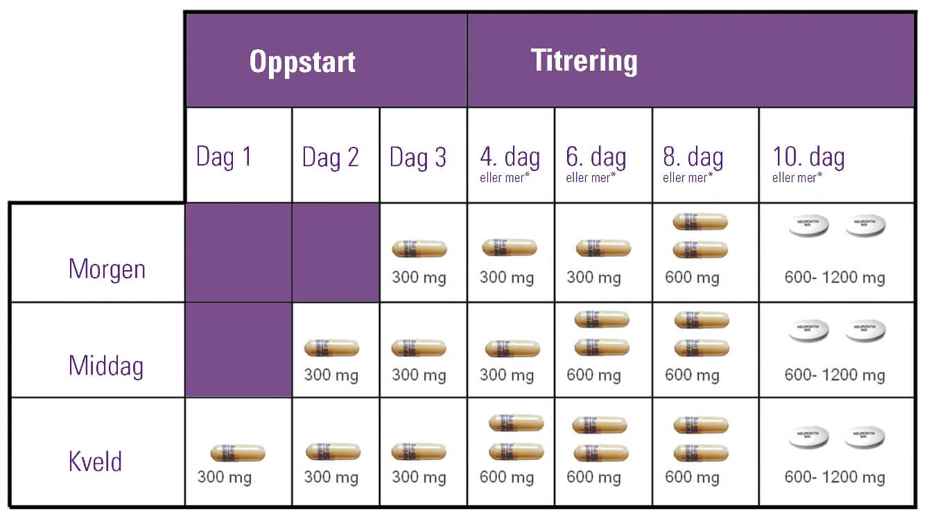 *Basert på den enkelte pasients respons og toleranse, kan dosen økes videre med 300 mg/dag hver 2-3 dag, inntil maksimal dose på 3600 mg/dag.1