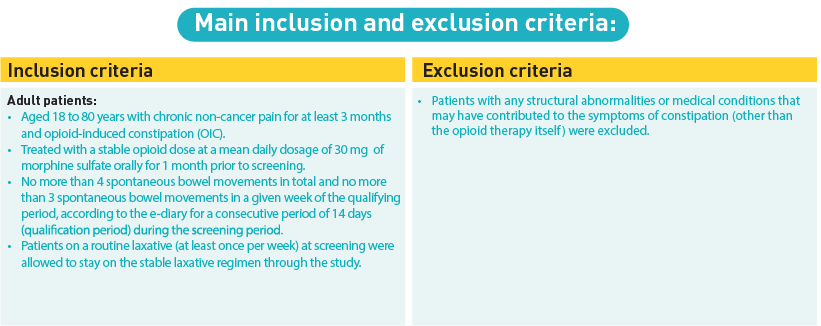 Participants were adults aged 18 to 80 years who had been on a stable opioid regimen and exhibited fewer than four spontaneous bowel movements per week, among other criteria. They were randomized in a 1:1 ratio to receive either 0.2 mg of naldemedine or a matching placebo once daily for 12 weeks, following a 2–4 week screening phase. Randomization was stratified based on the average total daily opioid dose into two categories: 30–100 mg and over 100 mg of oral morphine sulphate equivalents.