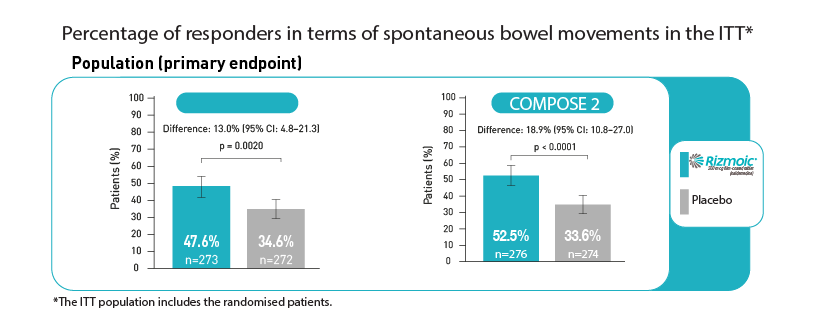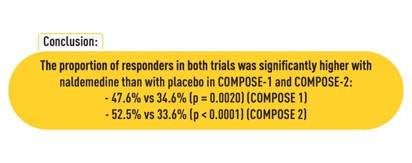 - COMPOSE-2: Similarly, a higher responder rate was observed in the naldemedine group (52.5%) compared to placebo (33.6%), with p < 0.0001.