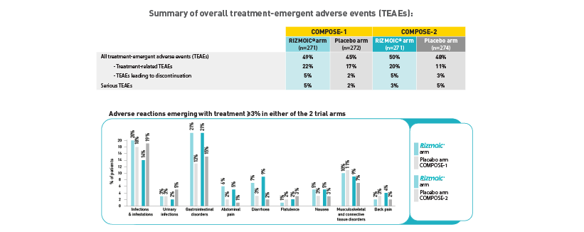 - In COMPOSE-1, 49% of the naldemedine group experienced any TEAEs, compared to 45% in the placebo group.