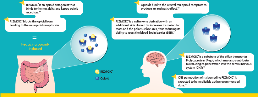 Rizmoic® er et legemiddel spesifikt utviklet for behandling av opioidindusert forstoppelse, OIC.5 Virkestoffet naldemedin, er en perifert virkende μ-opioidreseptorantagonist (PAMORA) og binder seg til my-, delta- og kappa-opioidreseptorene i mage-tarm.5