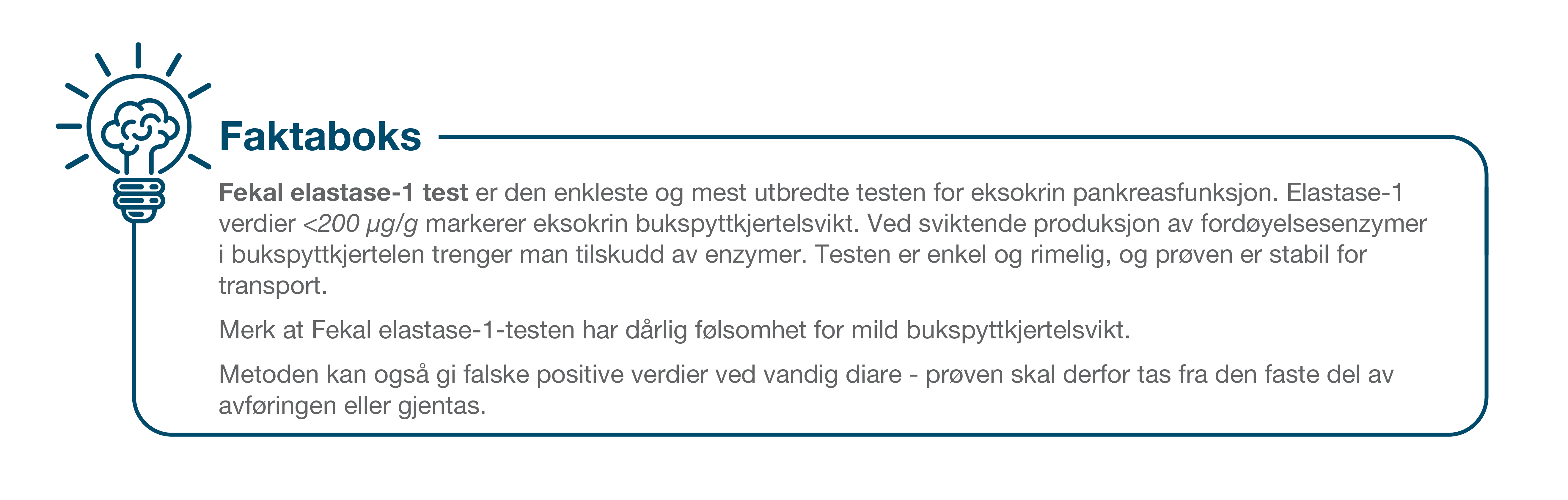 Ved manglende effekt eller behov for høye enzymdoser kan det gis syrehemmende medikamenter for å øke enzymenes effekt. Pankreasenzymer kan man få på blå resept hvis man har påvist lav elastase ved positiv fekal elastase-1 test.