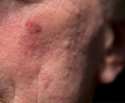 Den typiske hudforandringen ved aktinisk keratose er en brunrød, skjellete flekk med størrelse fra et par millimeter opp til et par centimeter. Et typisk kjennetegn er at flekken kjennes ru eller sandpapiraktig når man tar på den med fingeren. Av og til kan man pirke den bort, men som regel kommer den tilbake.2,3