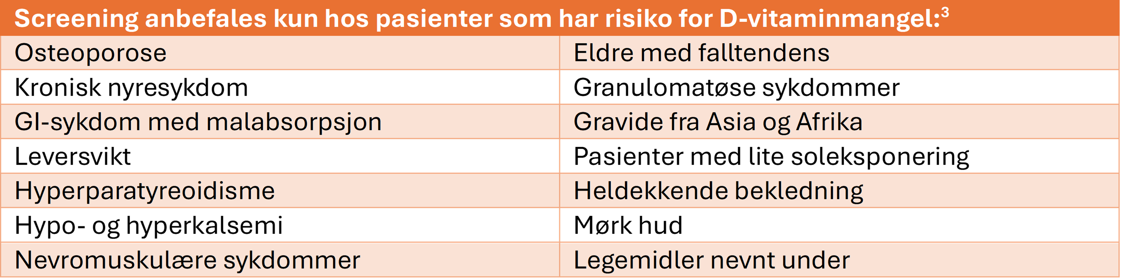 - Pasienter som bruker antiepileptika, antivirale legemidler for HIV/AIDS, tuberkulosemiddel og KOLS-middel (theofyllin), orlistat, kolestyramin, amiodaron anbefales screening på grunn av risiko for D-vitaminmangel.3